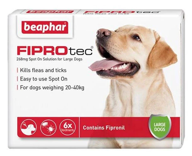 Beaphar FIPROtec® Spot-On for Large Dogs kills fleas and ticks on dogs, and continues to kill fleas for up to five weeks and ticks for up to four weeks. Suitable for dogs over 8 weeks of age and weighing between 20-40kg. Beaphar FIPROtec® Spot-On for Large Dogs kills fleas and ticks on dogs, and continues to kill fleas for up to five weeks and ticks for up to four weeks. Suitable for dogs over 8 weeks of age and weighing between 20-40kg.