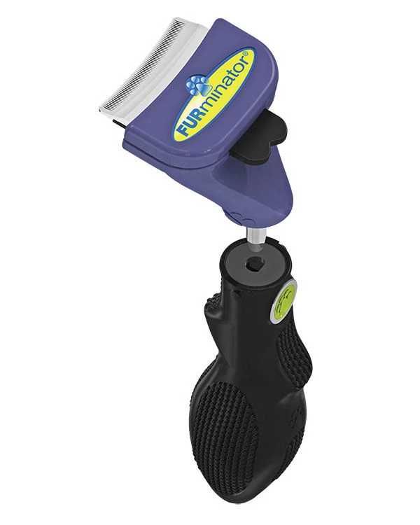 deShedding curved edge reaches through topcoat to safely and easily remove the undercoat
